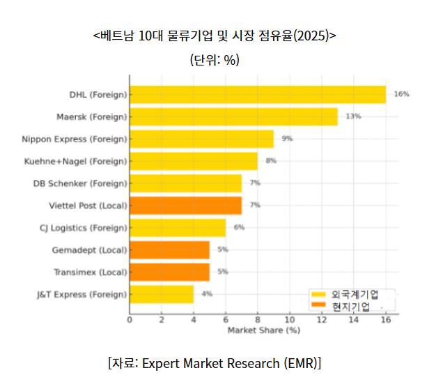 베트남 물류 시장에서 글로벌 기업들은 상당한 점유율을 차지하고 있으며, 특히 DHL, Maersk, Nippon Express, Kuehne+Nagel, DB Schenker 등이 상위권을 형성하고 있습니다. 이들은 베트남의 제조업 성장과 전자상거래 확대로 인한 물동량 증가의 주요 수혜를 입고 있습니다.