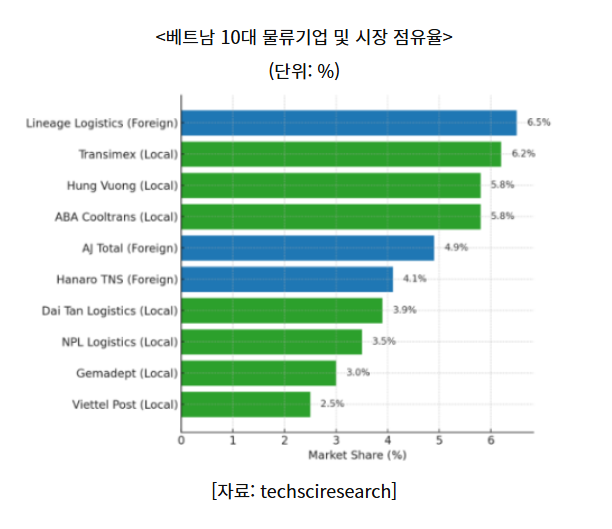 AJ Total Vietnam(AJ Total Vietnam - 한국 AJ그룹 계열의 베트남 콜드체인 창고 및 물류 서비스): 4.9%의 점유율을 기록하며 한국 기업 중 상위권에 속합니다.