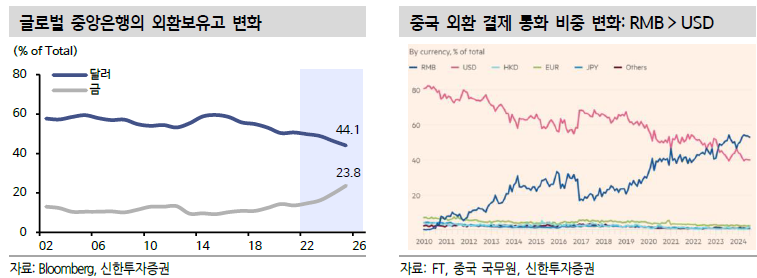 - 가치의 보존 수단으로 달러 자산이 아닌 금 보유량을 대폭 늘리고 있다. 미국의 공급망 개편 시도에 대응하기 위해 반서방진영은 달러 결제 차단 리스크를 회피할 수 있는 수단으로 디지털 위안화 결제 확대를 시도 중이다.