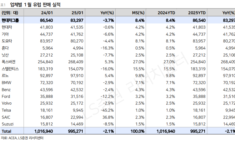 • 2025년 2025-02-27 미국 시황 정리]], 유럽 1월 판매량: 전기차 반등 - 유럽 판매량 -2.1% YoY, 2025년 1월 유럽(EU+EFTA+UK) 자동차 판매량은 99.5만대(-2.1% YoY)를 기록했다. 국가별로는 영국/프랑스/독일/이탈리아/스 페인 각각 -2%/-6%/-3%/-6%/+5%를 기록했다. 유럽 전반적인 소비 심리 악화로 대부분 업체들의 판매량이 전년 대비 감소했다. 전기차 +19.8% YoY, 하이브리드 +16.9% YoY, 유럽 내 전기차(BEV+PHEV) 판매량은 24.2만대(+19.8% YoY)를 기록했다. [독일 중심으로 BEV 판매가 54% 증가]하면서, 유럽 전 기차 판매 증가를 견인했다. [2023년말부터 독일에서 보조금 지급을 중단]했다는 점을 감안했을 때, [기저효과가 컸던 것으로 추청]된다. [테슬라는 9,945대(-45.2% Yoy)를 기록]했다. 1) 최근 머스크가 독일 극우 지도자에 대한 지지 의사 표명 등 ‘정치 간섭’ 논란이 불거 지며 [소비자 반감]을 불러일으켰고, 2) [모델Y 페이스리프트 모델 준비로 생산 라인을 일부 조정한 영향]으로 파악된다. 하이브리드 (HEV) 판매량은 34.7만대(+16.9% YoY)를 기록했다