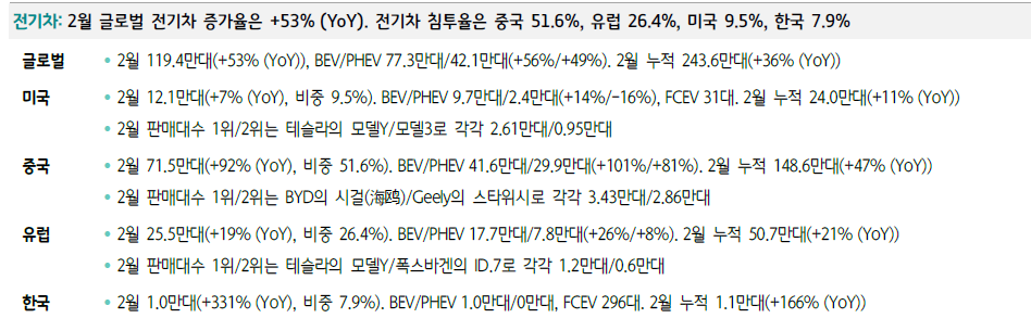 • 2025-04-02, 2월 글로벌 전기차 증가율은 +53% (YoY). 전기차 침투율은 중국 51.6%, 유럽 26.4%, 미국 9.5%, 한국 7.9%