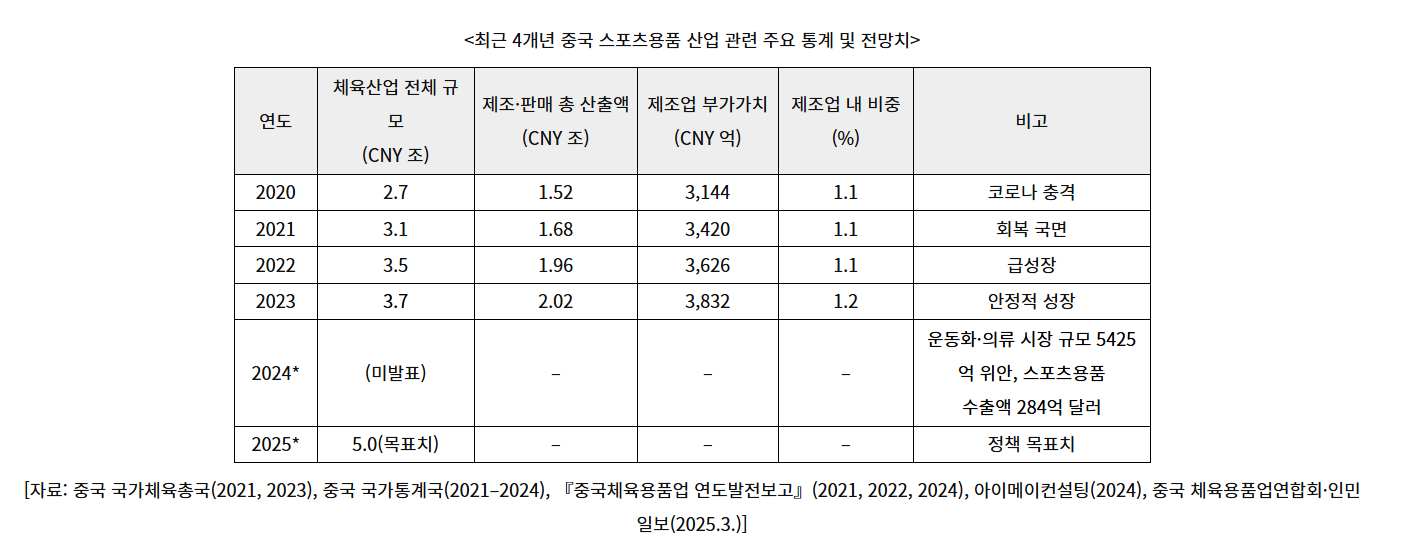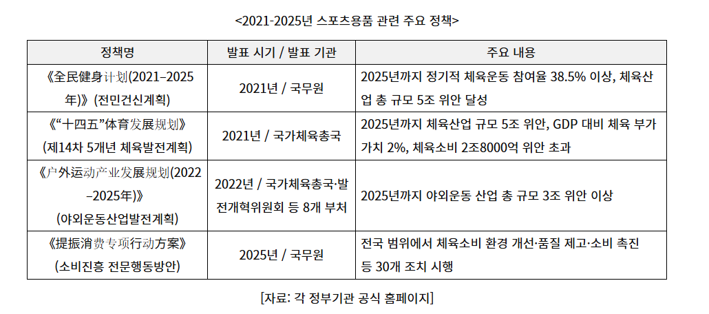 또한, 야외운동산업발전계획(2022–2025년)과 소비진흥 전문행동방안 등 후속 정책을 통해 야외 스포츠와 스포츠 소비를 더욱 활성화하고, 관련 산업의 성장을 지원하고 있습니다.