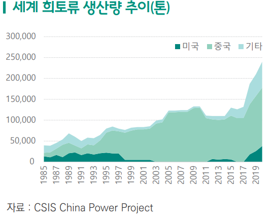 • 중국은 1990년대 후반 이후 전 세계 생산량의 90% 이상을 차지했었으나, 호주가 2011년부터 희토류 생산을 시작하고 미국도 2018년부터 희토류 생산을 재개하면서 중국의 비중은 차츰 감소 하는 추세