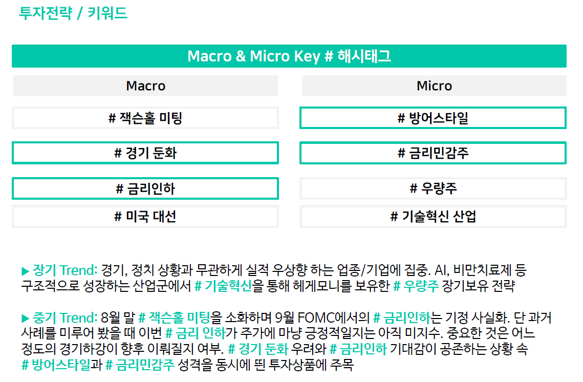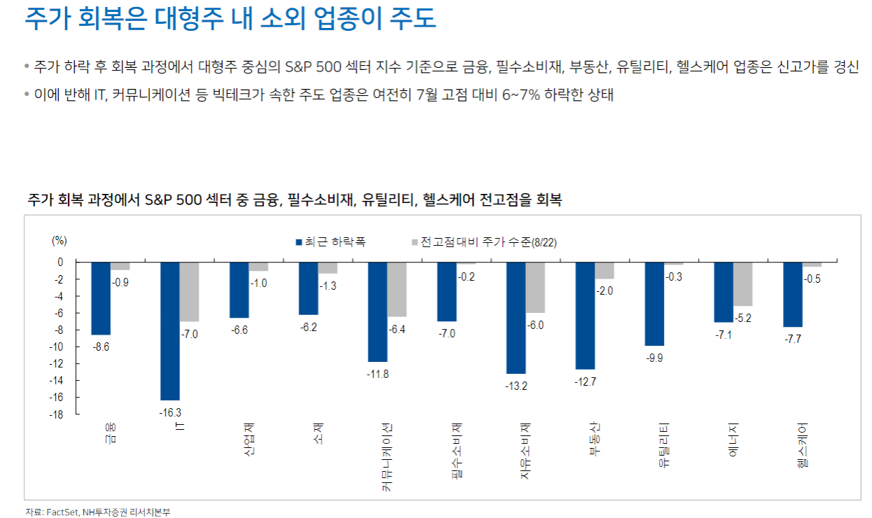 기존 주도주였던 빅테크 주식의 회복은 더딘 상황. 미국 주식시장 회복은 대형주 중에서도 금융, 필수소비재, 유틸리티 등 기존 주도주 외 업종 중심으로 나타남. AI 고점 논란과 경기 침체 우려는 확대되지 않을 전망이나 미국 대선 불확실성과 엔화 변동성 리스크는 여전히 경계해야 할 변수. 당분간 시장에 대한 눈높이를 낮추는 것이 효과적이라는 판단)