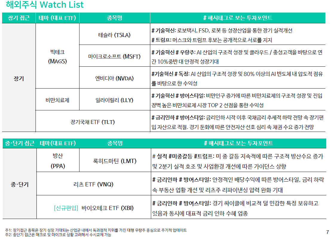 대형주 중에서 시장의 눈높이가 낮은 업종 중심의 투자가 효과적일 전망. 금융, 필수소비재, 헬스케어 업종 비중이 상대적으로 높은 미국 고배당주 ETF와 미국 금융, 글로벌 방위산업 섹터 ETF가 해당. 1)미국 고배당주 ETF는 VYM, SCHD, TIGER 미국배당다우존스 등이 대표적. 2)미국 금융 섹터 ETF는 XLF와 KODEX 미국S&P500 금융이 해당. 금융 섹터 중에서 글로벌 지수사업자와 거래소, ETF 운용사 등에 투자하는 테마 ETF인 KODEX 미국ETF산업Top10 Indxx도 유망하다고 판단. 3)글로벌 방위산업 ETF는 미국 상장 SHLD와 국내 상장 TIMEFOLIO 글로벌우주테크&방산액티브 등이 해당. 이 밖에 대형주를 시가총액 가중이 아닌 동일가중으로 투자하는 ETF도 시장 대비 안정적인 성과를 보일 수 있음)리테일 투자자를 위한 Global Watch List (24.8.28) (key: 리츠, 바이오테크, 빅테크) -잭슨홀 미팅: 9월 금리인하 사실상 확정) -과거에는 경기가 부진한 상황에서 금리인하를 하면 사실 주가에 좋지 않은 사례가 많았음. 특히 리세션 여부가 중요) -경기 우려는 결론내리기 어려운 상황에서 3분기 증시는 기술주, 경기민감주보다 경기방어주, 금리인하 수혜주가 아웃퍼폼)
