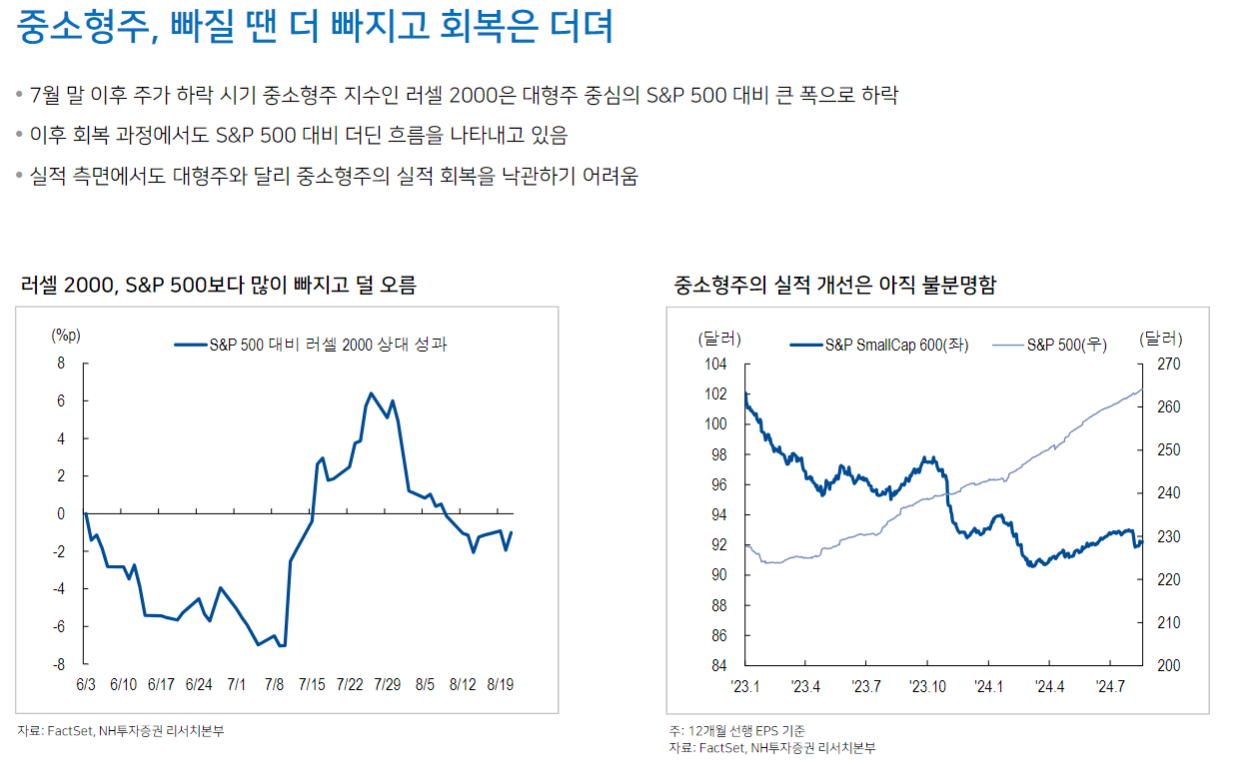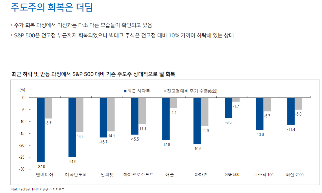 기존 주도주였던 빅테크 주식의 회복은 더딘 상황. 미국 주식시장 회복은 대형주 중에서도 금융, 필수소비재, 유틸리티 등 기존 주도주 외 업종 중심으로 나타남. AI 고점 논란과 경기 침체 우려는 확대되지 않을 전망이나 미국 대선 불확실성과 엔화 변동성 리스크는 여전히 경계해야 할 변수. 당분간 시장에 대한 눈높이를 낮추는 것이 효과적이라는 판단)