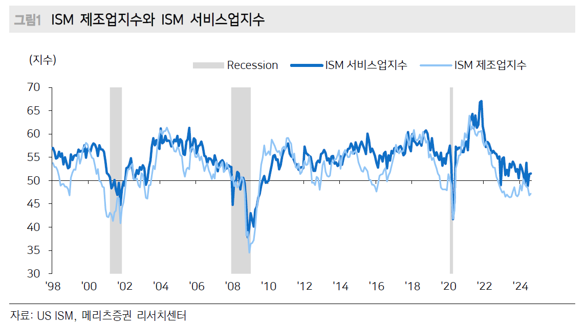 그런데 미국의 경기침체 여부를 놓고 볼 때 1997년 ISM 서비스업지수가 함께 발표되기 시작한 이후 서비스업 지수가 추세적으로 기준선을 하회하지 않는다면 제조업 지수의 기준선 하회만으로는 침체였던 적이 없음. 미국 산업 구조는 90년대 IT 혁명 이후 80년대까지 제조업 중심 국가에서 탈피, 산업이 고도화된 점을 참고할 필요
