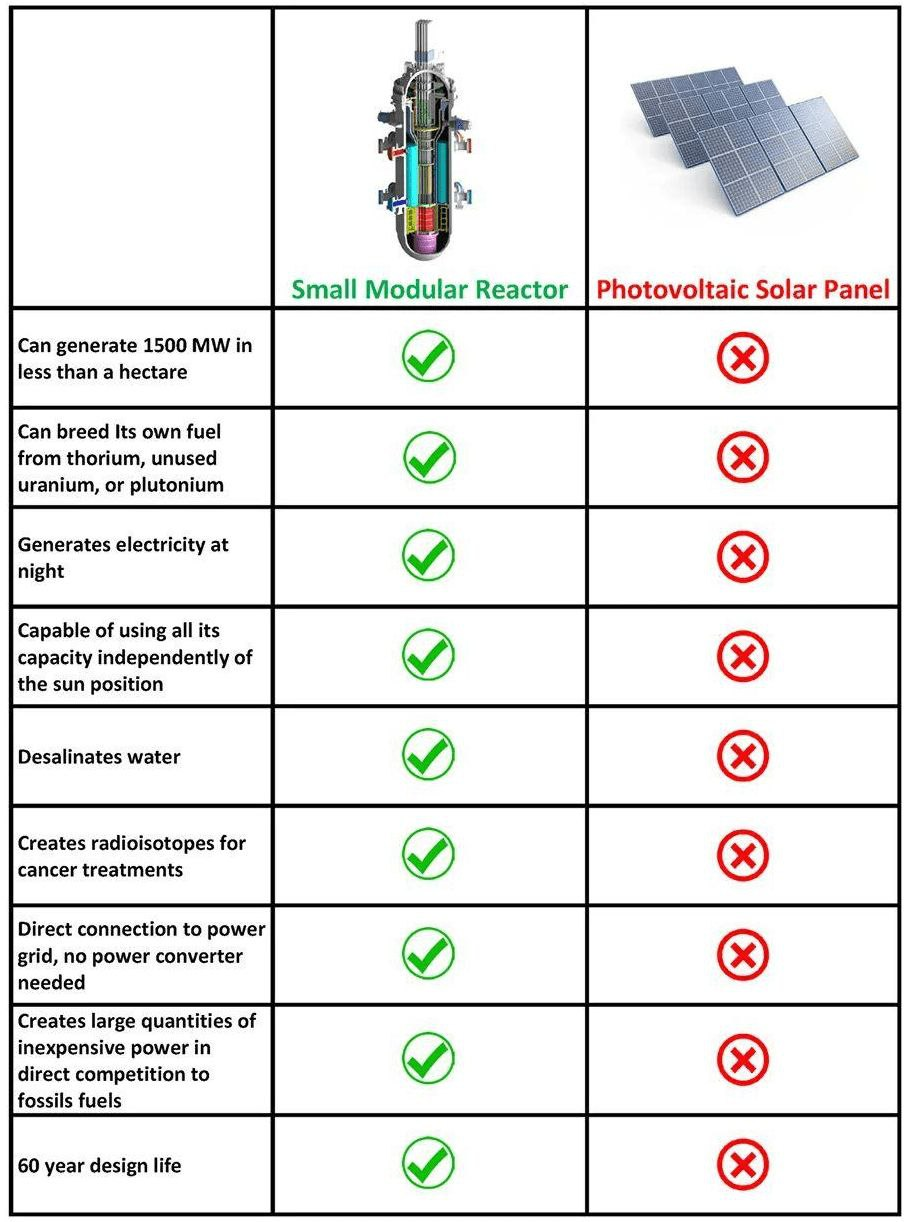 1헥타르 미만 부지에서 1500MW 발전 가능: SMR ✅ / 태양광 ❌토륨, 미사용 우라늄, 플루토늄으로 자체 연료 생산 가능: SMR ✅ / 태양광 ❌