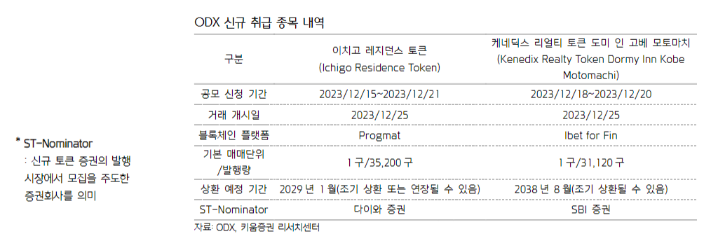 - ODX에 공개된 자료에 따르면, 신규 토큰 증권은 ‘케네딕스 리얼티 토큰 도미 인 고베 모토마치(Kenedix Realty Token Dormy Inn Kobe Motomachi)’와 ‘이치고 레지던스 토큰(Ichigo Residence Token)’이다. 두 가지 모두 부동산 수익증권을 토큰화 하는 상품으로, 공모 형태로 진행될 예정이다. 케네딕스의 경우 총 발행 규모는 약 33.6억 엔으로 발표되었으며, 이치고 레지던스 토큰은 약 29.3억 엔으로 추정
