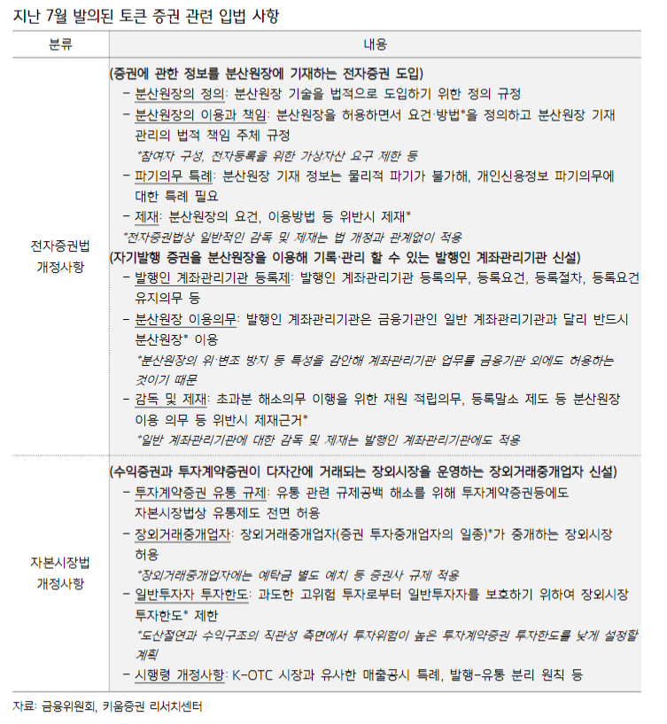- 만약 KRX가 신종 증권에 대한 상장 시장 운영을 시범적으로 시작할 경우, 토큰 증권 법제화에 시간이 다소 소요되더라도 상장 시장을 통한 투자계약증권의 유통 가능성이 열릴 수 있어 투자계약증권 발행에 대한 관심도 더욱 높아질 수 있다. 따라서 연말까지 토큰 증권과 관련된 규제 변화에 관심이 이어질 것으로 보임