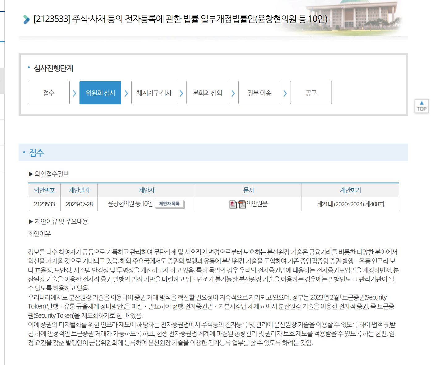 - 물론 의안정보시스템에 공개된 정보에 따르면, 12월 5일 진행된 3차 법안심사에서 관련 법안 논의가 진행되지 못한 것으로 보인다. 이에 연내 토큰 증권 시장의 제도화 가능성이 높아졌다고 말하기 어려운 측면이 있다. 그러나 만약 12월 중 추가 법안심사 소위원회 일정이 잡혀 관련 법안에 대한 심사가 진행된다면, 입법화가 예상보다 빠르게 진행될 여지도 남아있다.