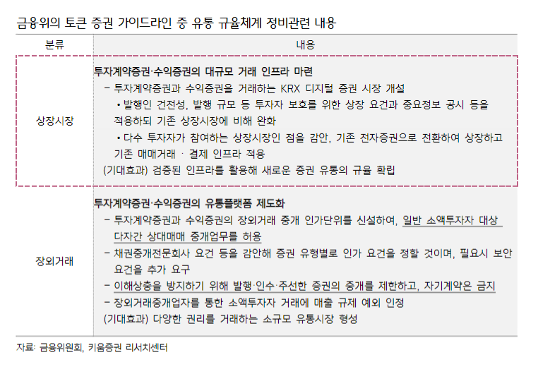 - KRX의 신종 증권(비금전신탁 수익증권·투자계약증권)에 대한 상장시장 운영은 토큰 증권의 유통 규율 체계에 해당되는 만큼 관련 내용의 변화도 토큰 증권 관련 기대를 높일 수 있는 이슈이다. 특히 비금전신탁수익증권의 경우 혁신금융서비스 지정을 받은 조각투자사의 자체 플랫폼을 통해 개인간 거래가 가능하나, 투자계약증권은 유통이 불가하다.