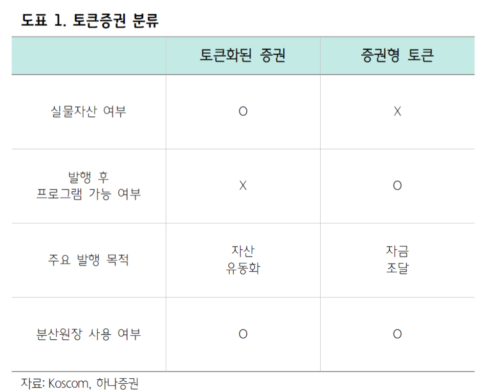 - 토큰증권을 토큰화된 증권과 증권형 토큰으로 분류하기도 하는데 Koscom 자료에 따르면 1) 토큰화된 증권은 부동산, 주식, 채권 등 증권인 실물자산을 블록체인을 통해 분산원장 기술 기반의 암호화된 토큰의 형태로 디지털화한 증권을 의미하며, 2) 증권형 토큰의 경우 기초되는 실물자산이 없고 프로그램 가능한 증권으로 토큰 그 자체에 투자하는 것을 뜻한다. 주로 토큰화된 증권은 실물자산 유동화 목적으로 발행되며, 증권형 토큰은 자금 조달을 목적으로 발행되는 것을 뜻하지만, 아직까지는 엄밀한 구분보다는 두 개념이 함께 토큰증권 으로 혼용되고 있다