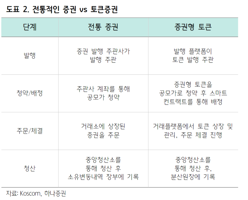 - 토큰증권이 기존 증권 대비 가지는 가장 큰 차이는 ‘스마트 컨트랙트’ 기능을 통해 공시, 청약 배정 등 다양한 업무를 분산원장 네트워크 속에서 자동화할 수 있다는 점임