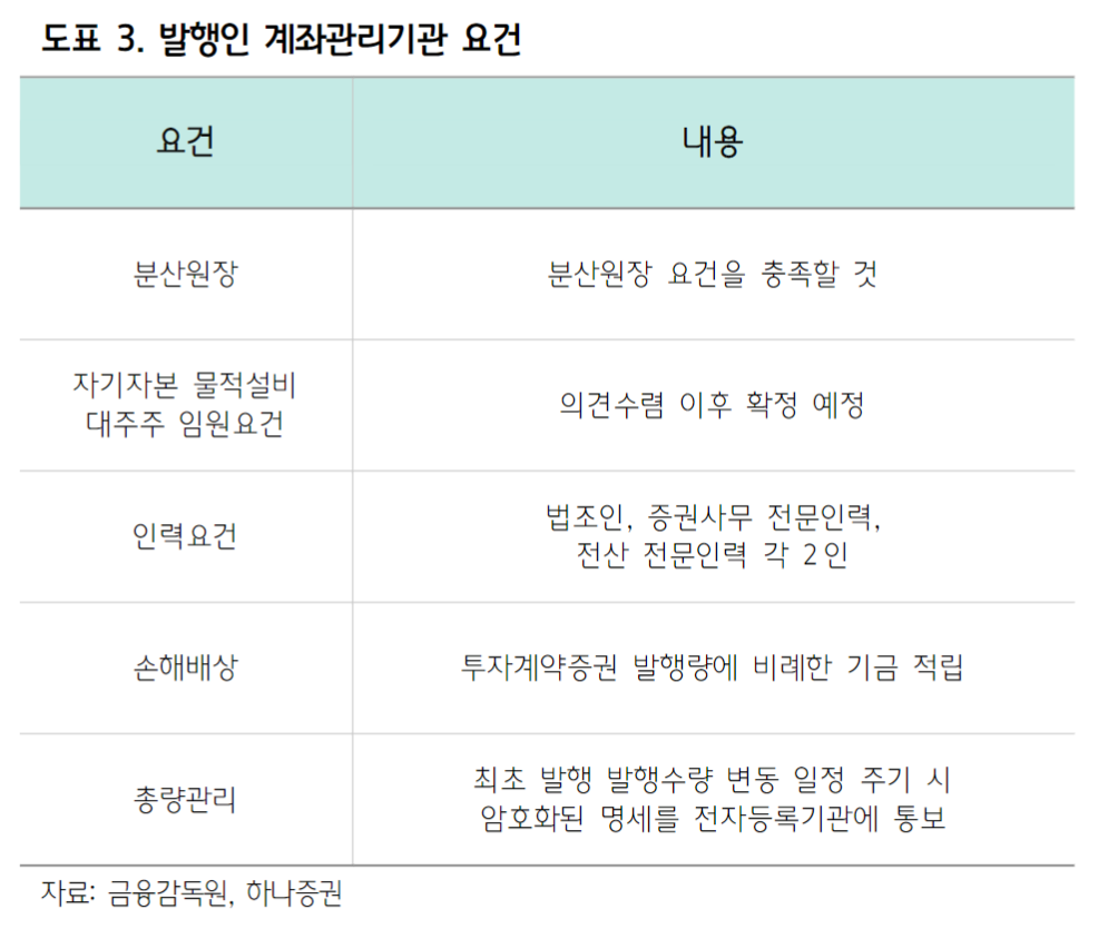 - 발행인 계좌관리기관은 블록체인의 높은 신뢰도로 인해 사후 조작이 불가능에 가깝기 때문에 인정되는 기관으로 증권사를 통하지 않고 직접 발행 가능함