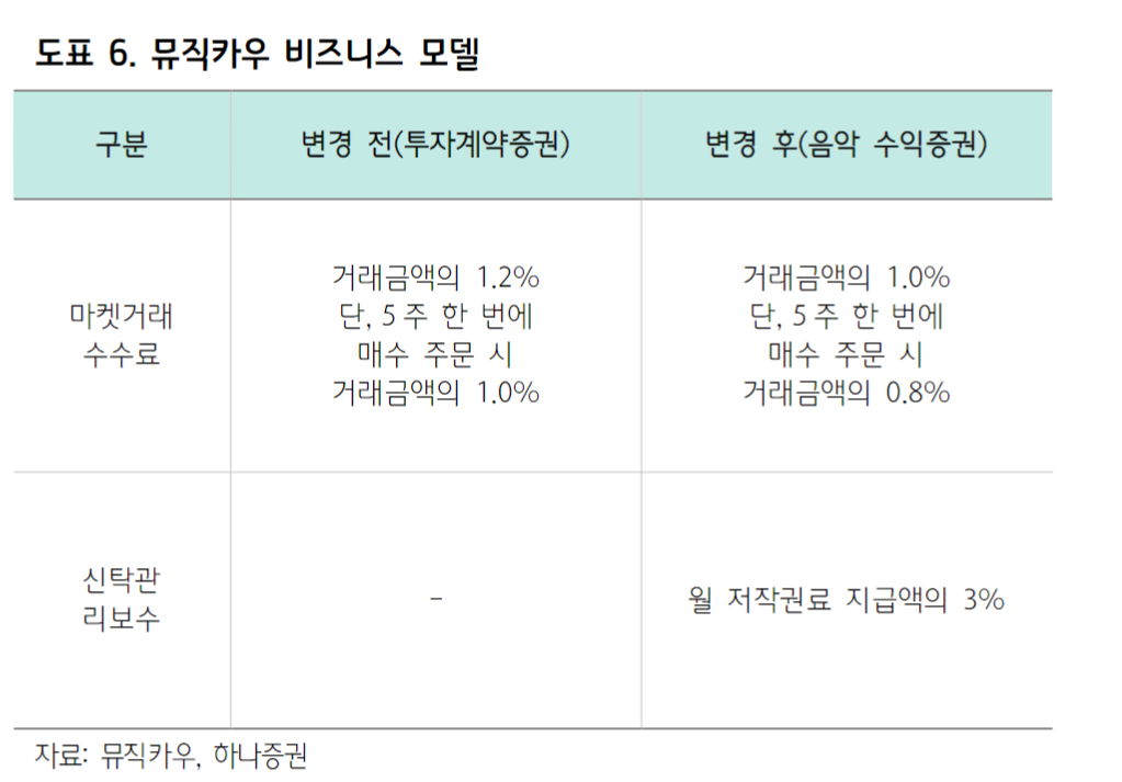 - 현재는 음악수익 증권으로 전환 운영됨에 따라 매입해서 신탁하는 구조는 유사하지만 키움증권과 저작권 관리처분 신탁계약을 체결하는 방식으로 변경됨에 따라 거래수수료 1.0%와 신탁관리보수로 월 저작권료 지급액의 3%를 수취하고 있음