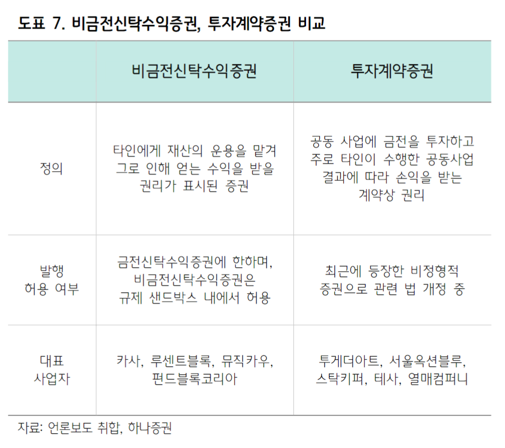 - 투자계약증권을 다루는 사업의 경우 금융당국의 적극적인 제도 개선 추진이 계획되어 있는데, 투자계약증권 사업자로 분류된 스탁키퍼, 서울옥션블루, 투게더아트, 열매컴퍼니, 테사 등은 2022년 11월 금융당국의 제재 면제가 결정되면서 사업 재개를 앞두고 있는 상황임