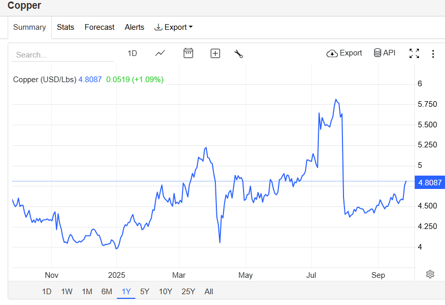 9월 8일 인도네시아 Grasberg 광산에서 발생한 대형 진흙사태(사망 2명, 실종 5명)로 Freeport-McMoRan(FCX)은 불가항력(force majeure)을 선언, 2025년 3분기 구리와 금 판매 가이던스를 각각 4%, 6% 하향 조정했습니다. 이 광산은 전 세계 채굴 구리의 3.2%, FCX 구리 생산의 약 30%, 금 생산의 70%를 차지합니다. 이 여파로 구리 선물은 파운드당 $4.77(4% 이상 급등), 두 달 만에 최고치를 기록했습니다. 동시에 페루 Hudbay Minerals의 콘스탄시아 광산도 시위로 가동이 중단되며 공급 충격이 심화되고 있습니다.